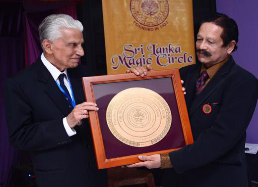 On a proposal by the then Editor H.D.N. Gunesekera it was decided to honour Kalabushana, Lt.Col. Ronald De Alwis with a newly established highest title of ‘President Emeritus’ considering his lifelong contribution to the field of Magic and the Sri Lanka Magic Circle in particular. A special plaue and certificate was awarded at a ceremony conducted at the AGM held on 29th March 2015.